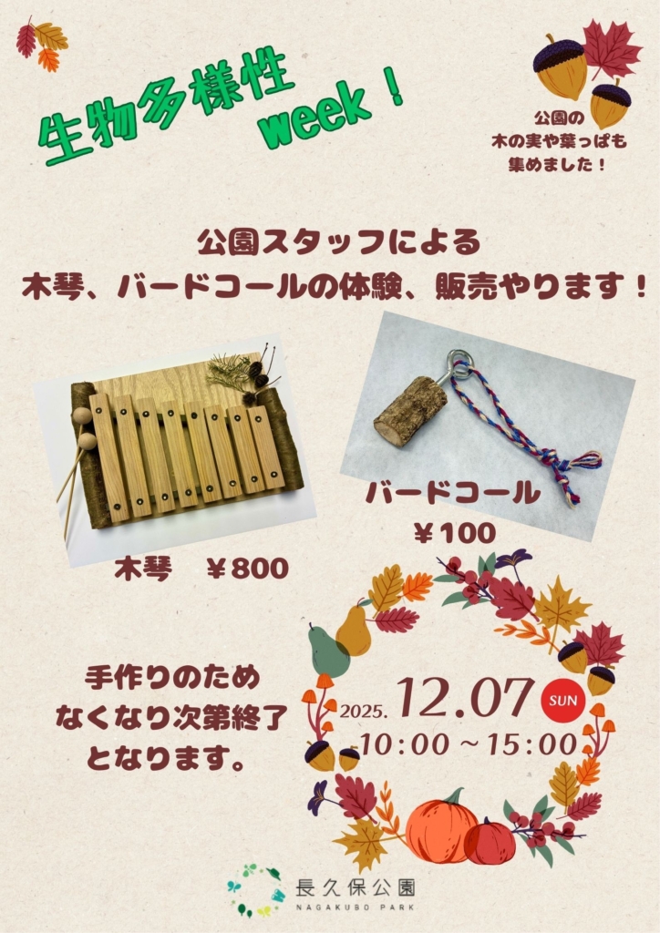 そして、公園では生物多様性weekとして12/7(日)に公園の木を使った木琴、バードコールの体験、販売を行います。