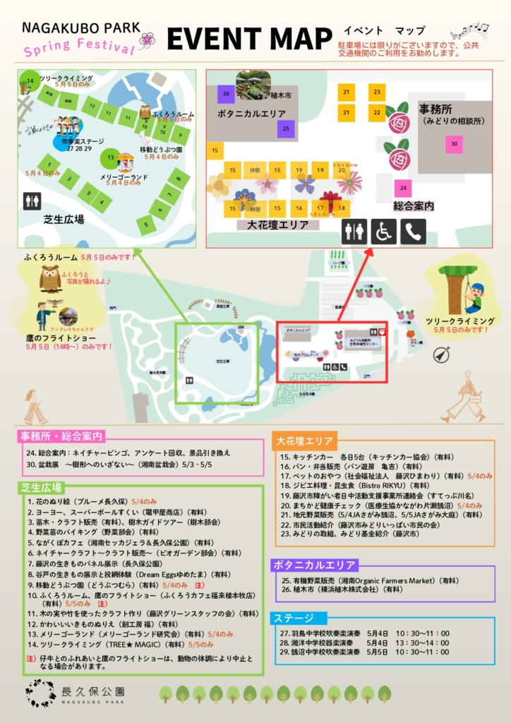春のみどりと花のまつり 開催します! 2026.04.10 2026年5月4日(月)、5月5日(火) 10:00~15:00 長久保公園で春のみどりと花のまつりを開催します。 メリーゴーランドやどうぶつむら、フクロウやタカがやってきます! クラフト体験や食、野菜販売のブースもありますよ。 ステージでは近隣中学生の演奏も♪ GW是非遊びにいらしてください! 皆さまのご来園お待ちしております。